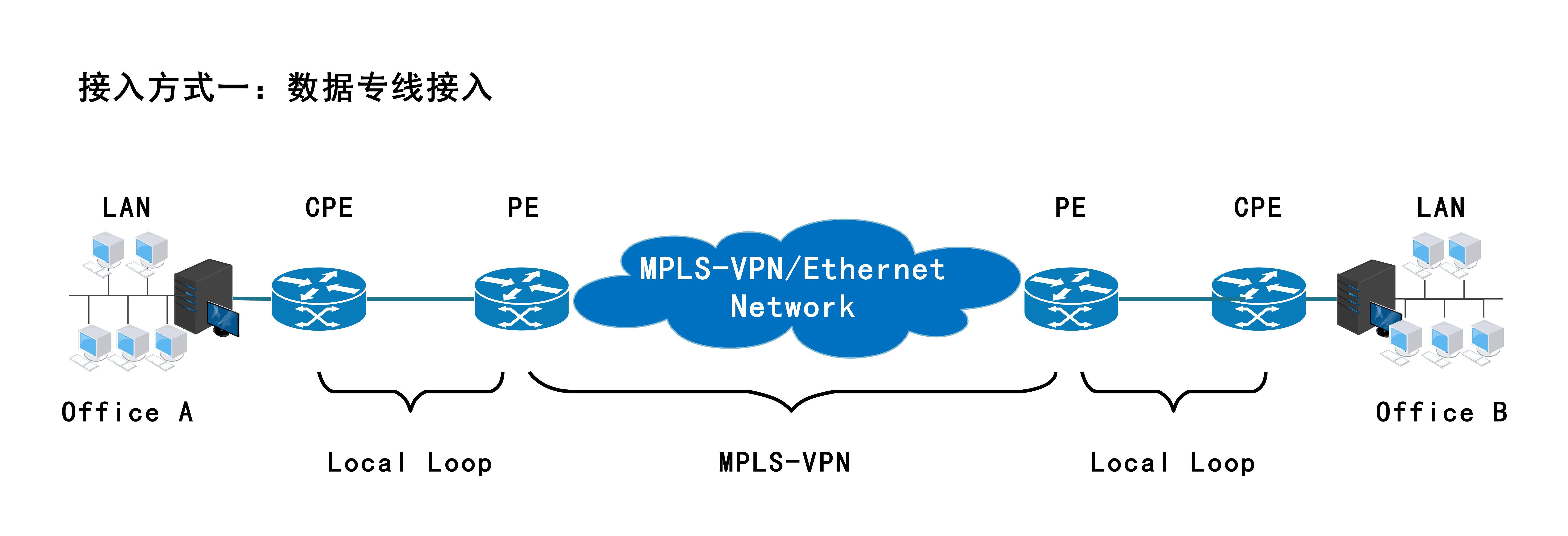 各地分支机构采用数据专线(SDH/MSTP)接入MPLS骨干网络节点,通过MPLS VPN线路与IDC实现数据传输。
