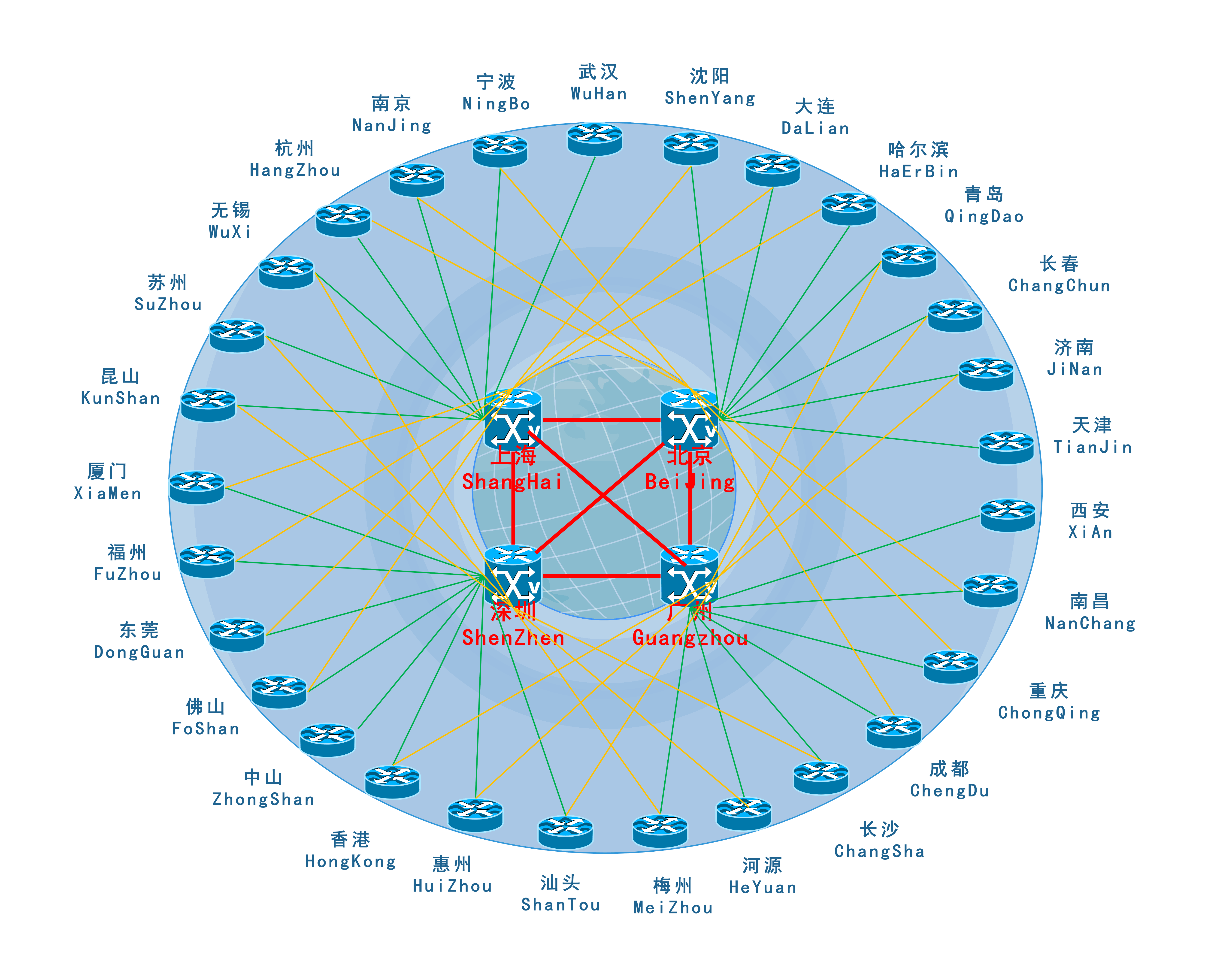 构建于中国骨干网之上,拥有很高的带宽和传输速率,从设备、线路和路由都有冗余保护措施,网络可靠性达到99.99%。