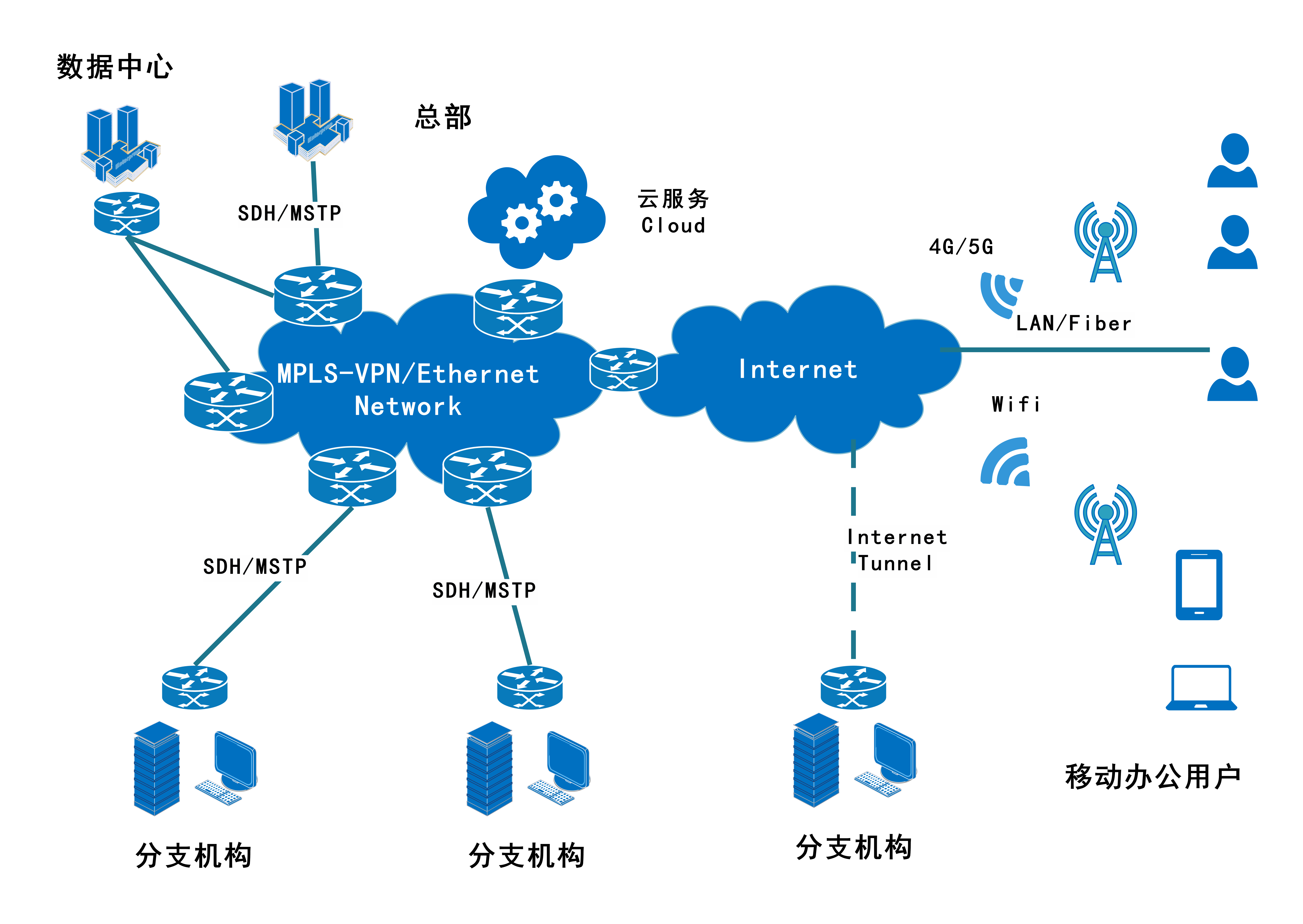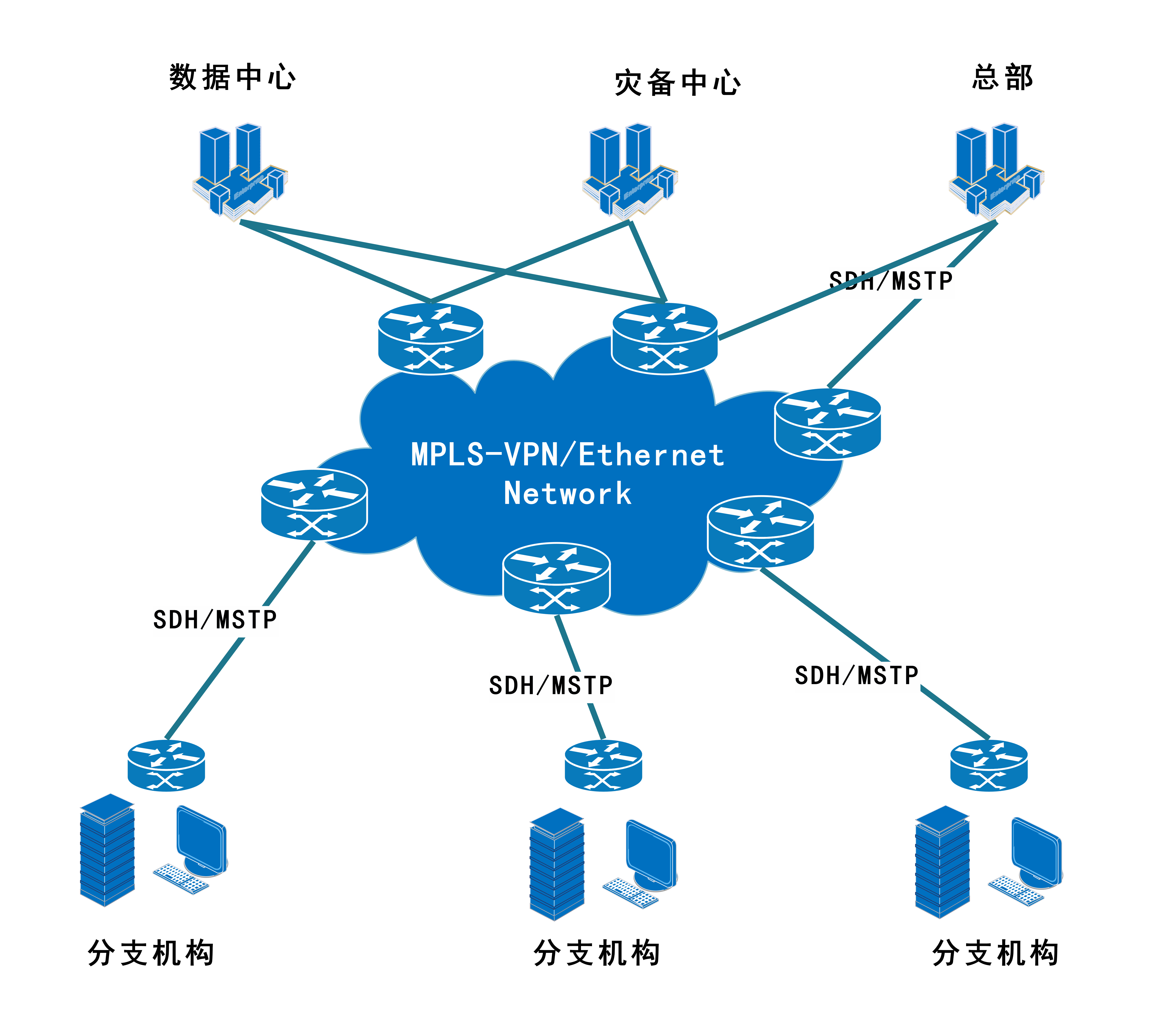 总部及分支机构采用数据专线(SDH/MSTP)或Internet接入MPLS骨干网络节点,通过MPLS-VPN网络与IDC、云平台等实现内部数据传输。